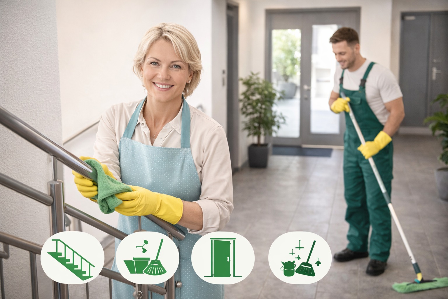 - Pflege von Gemeinschaftsflächen: Tägliche Grundreinigung für ein sauberes und sicheres Umfeld für Bewohner und Besucher.